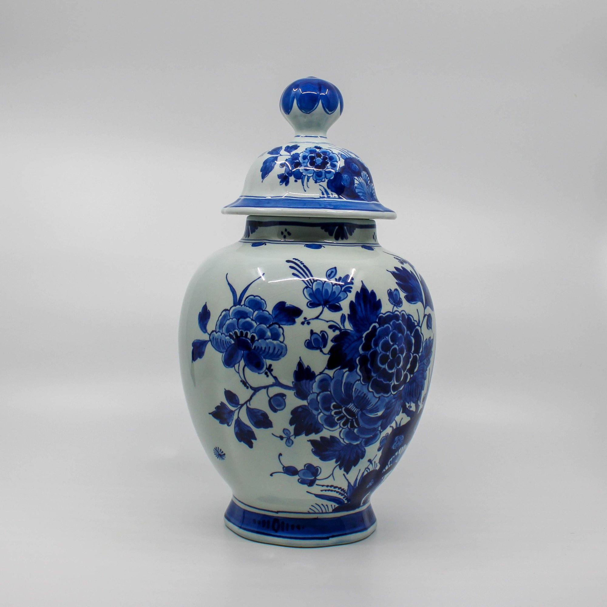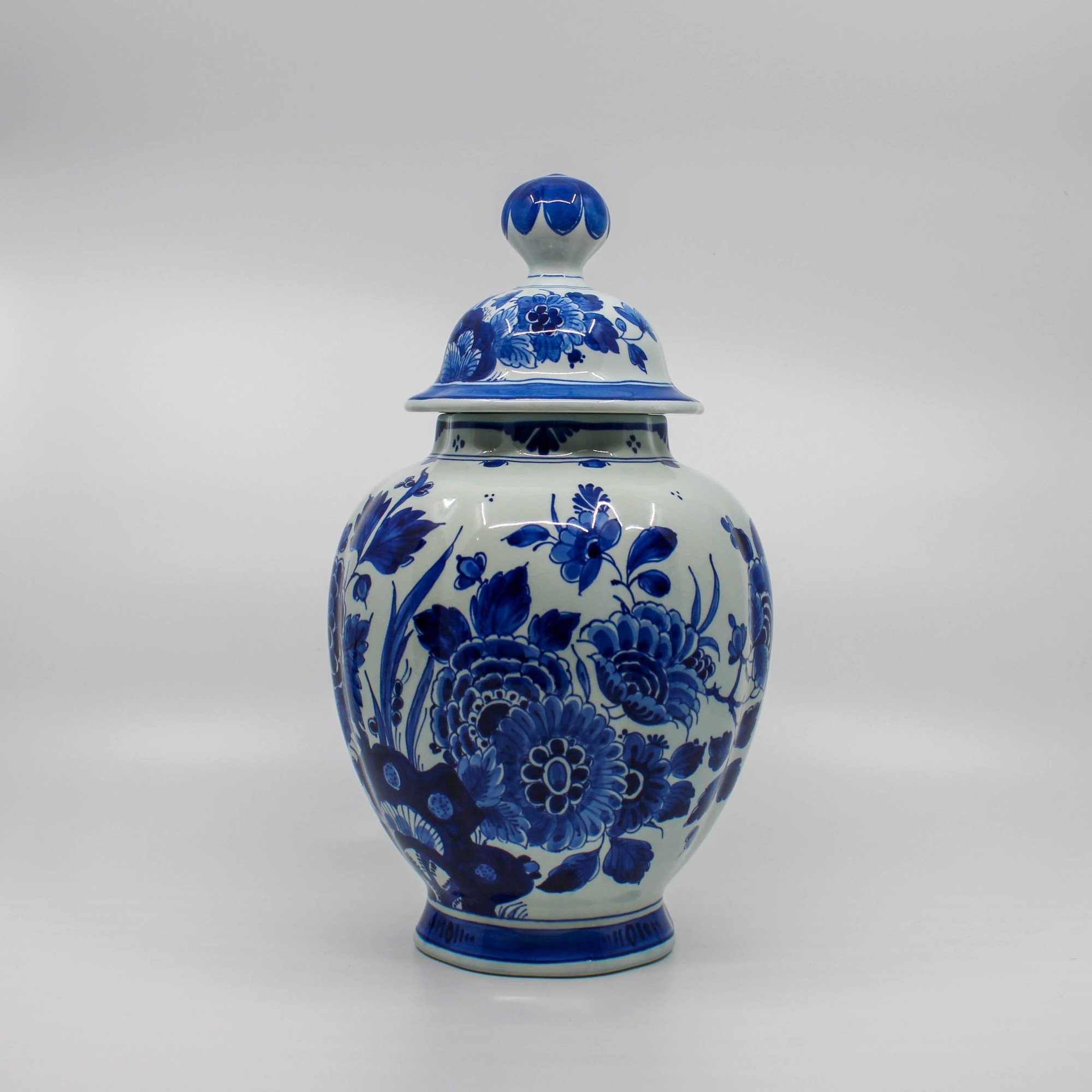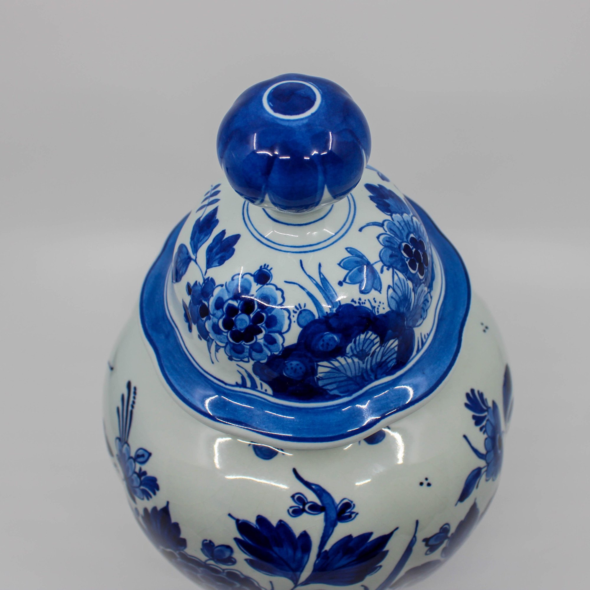 Deze handbeschilderde Delfts Blauwe dekselvaas is in 1975 vervaardigd bij de Porceleyne Fles in Delft.
