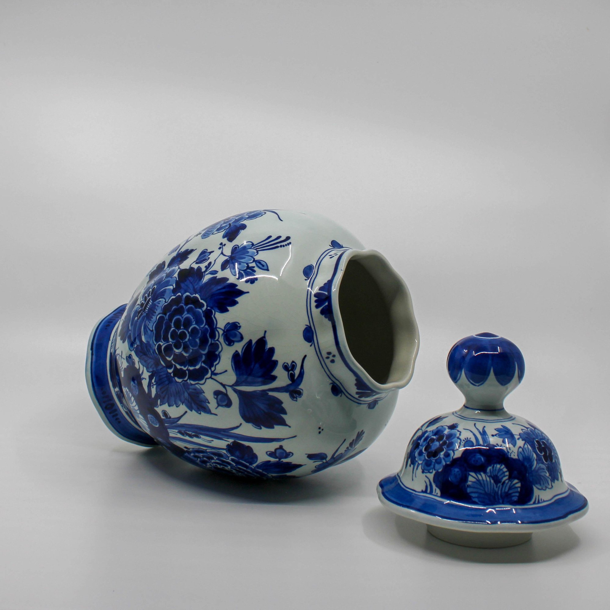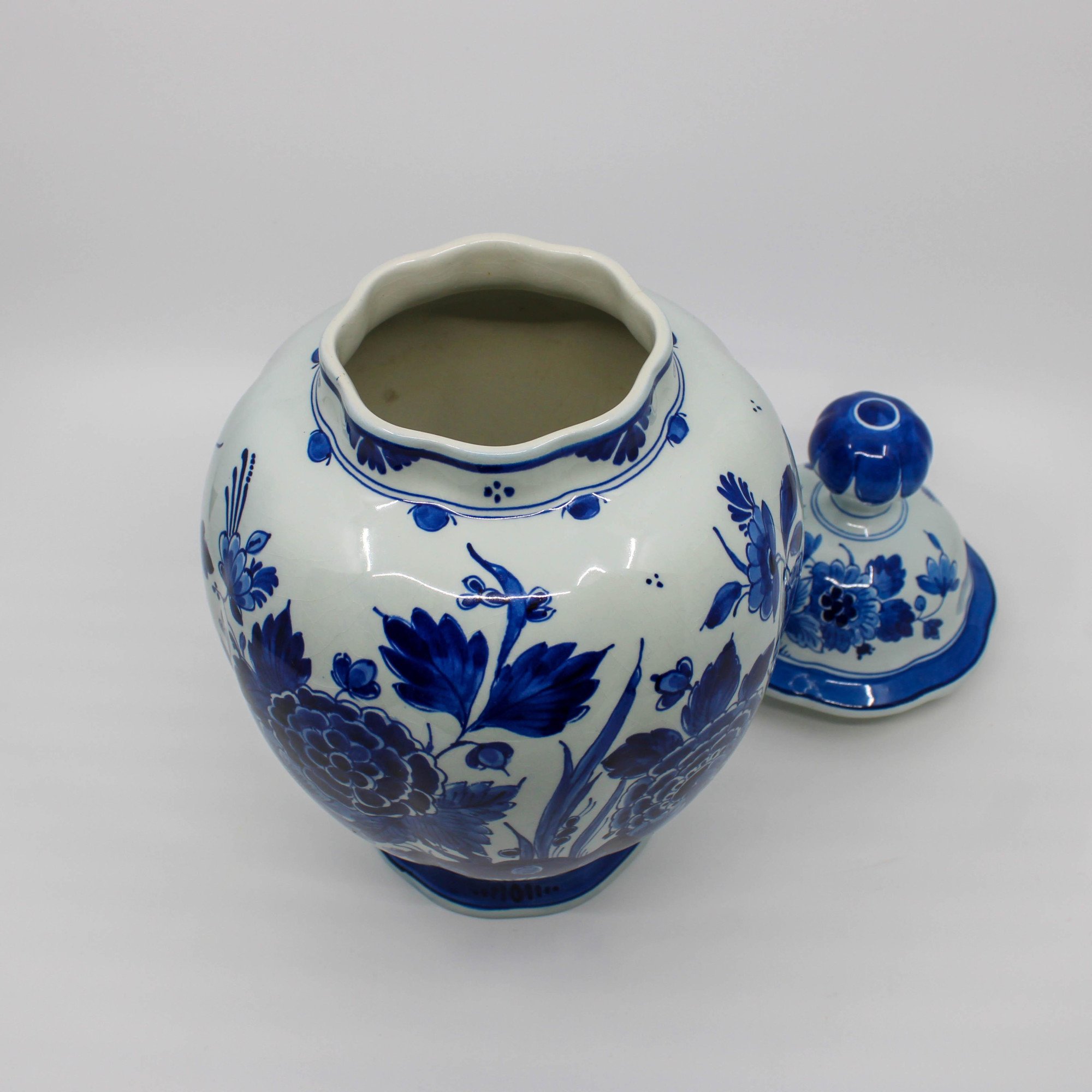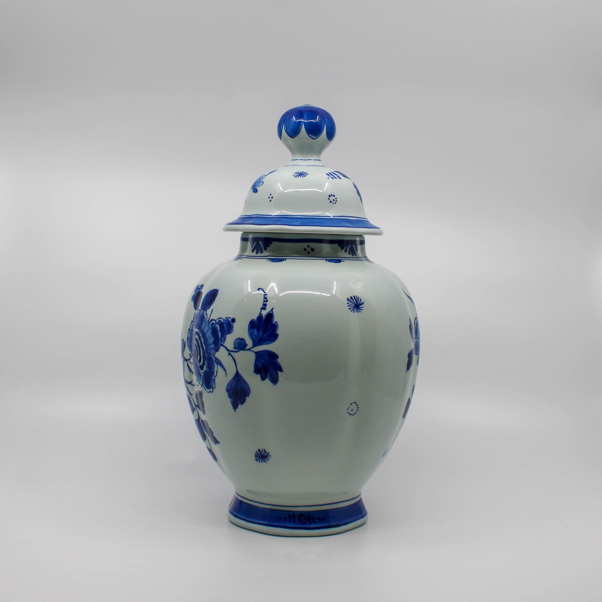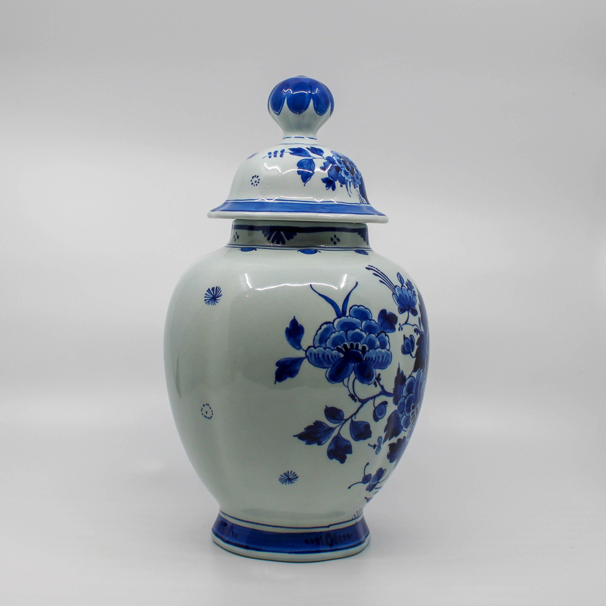 Deze handbeschilderde Delfts Blauwe dekselvaas is in 1975 vervaardigd bij de Porceleyne Fles in Delft.