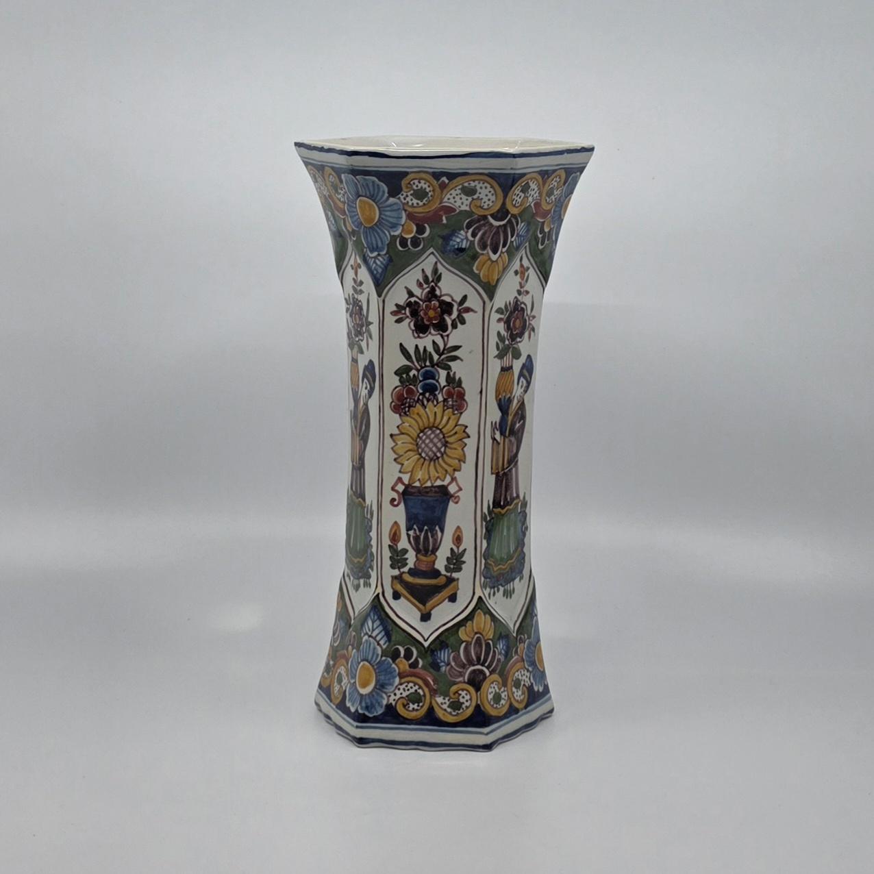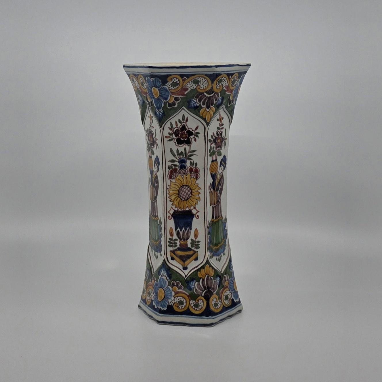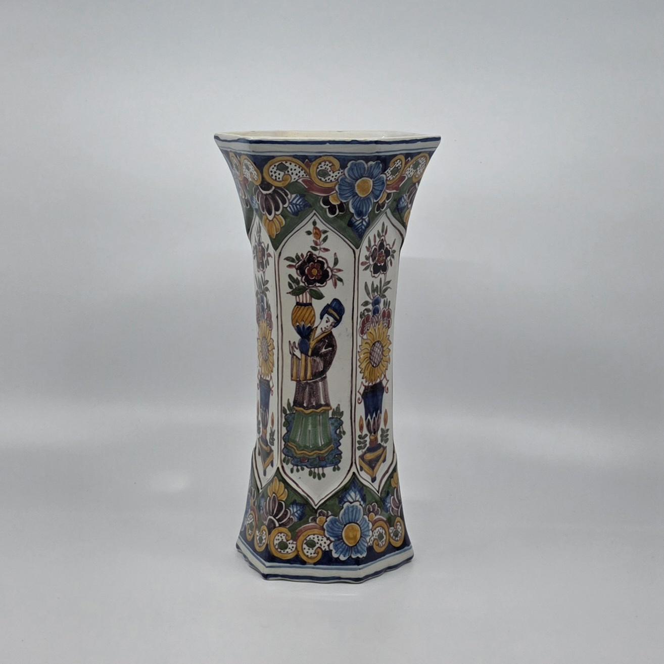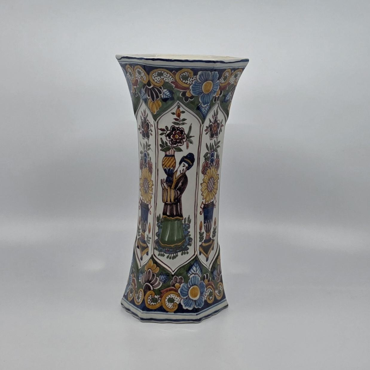Deze polychrome trompetvaas is met de hand beschilderd omstreeks 1960 bij de Nederlandse aardewerkfabriek Koninklijke Tichelaar Makkum in Friesland. De vaas is versierd met geometrische- en bloemmotieven en er is een Oosters-geklede dame afgebeeld die een bloemenvaas vasthoudt. Aan de onderzijde bevindt er zich het merk van de fabriek Tichelaar, modelnummer en de signatuur van de schilder.