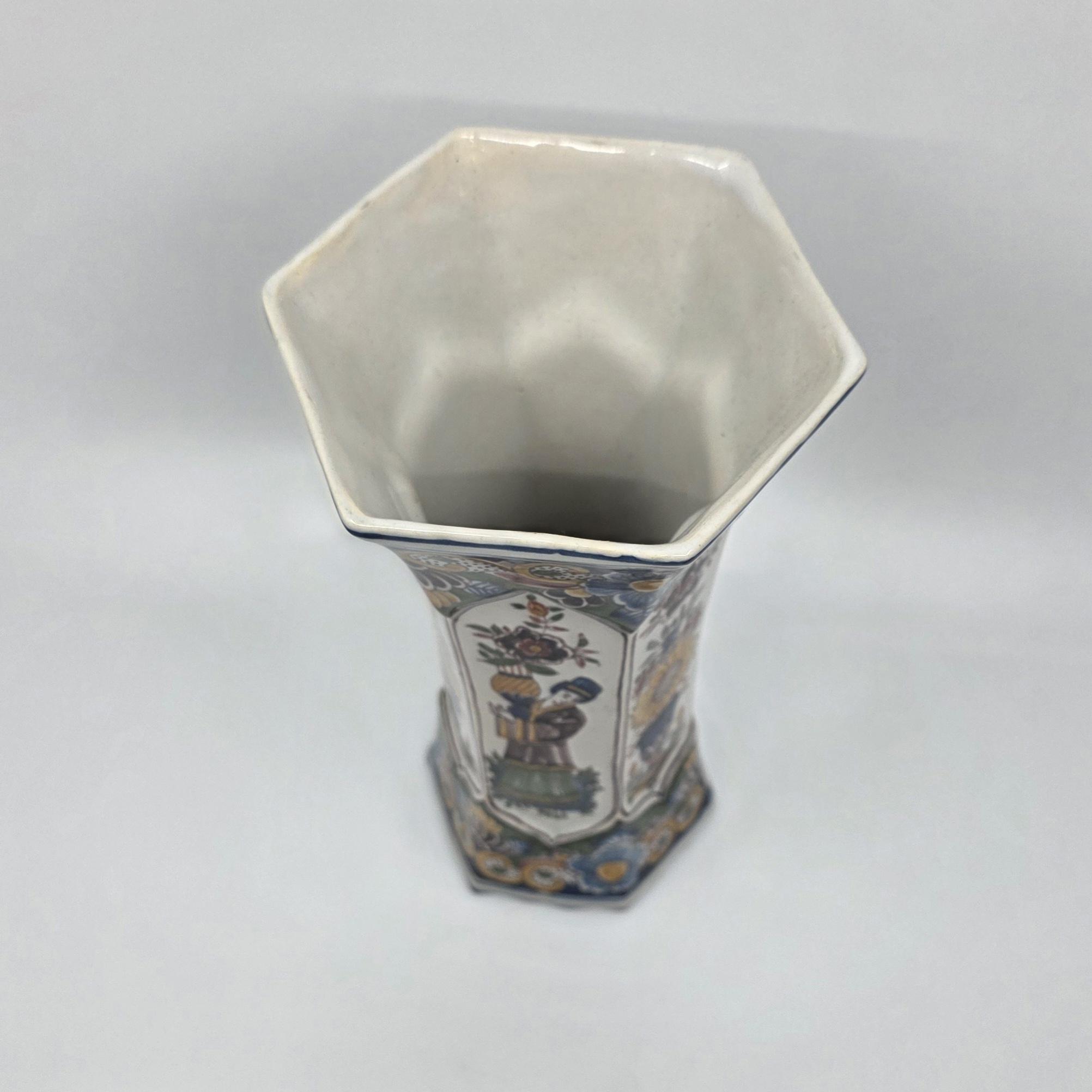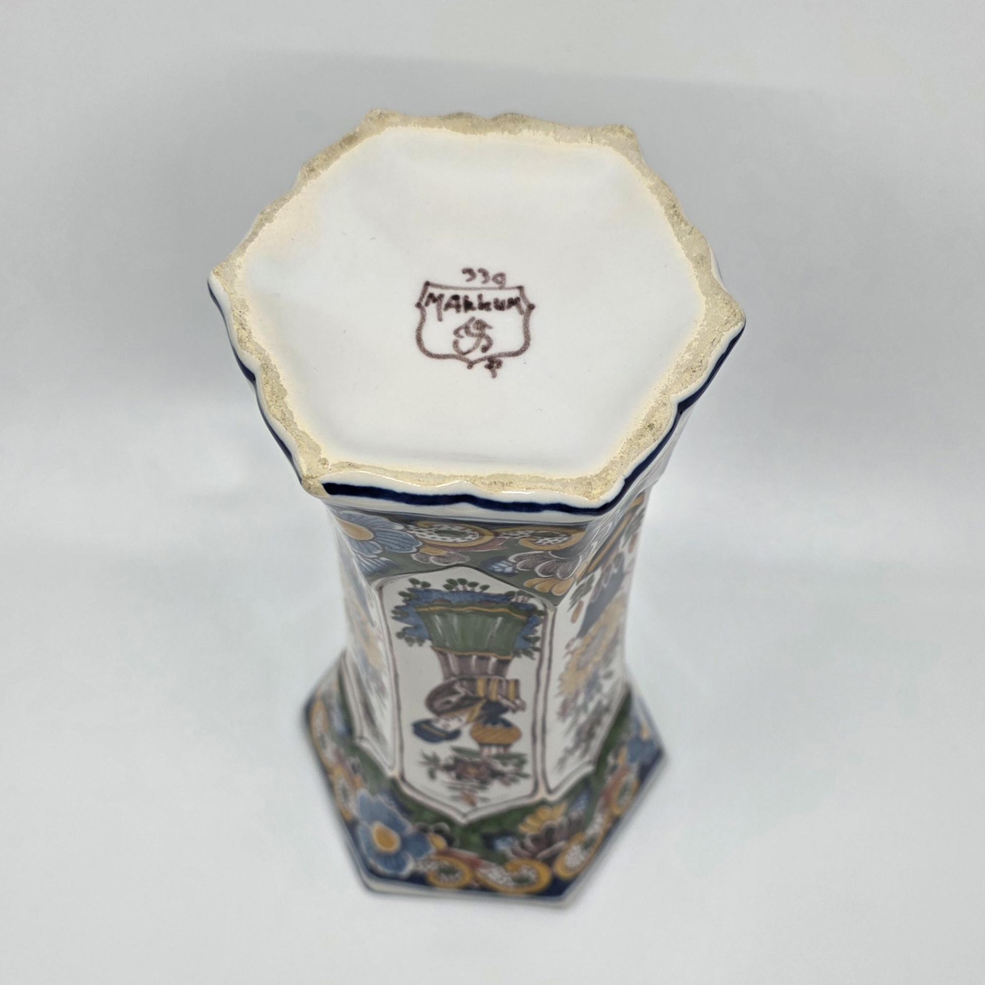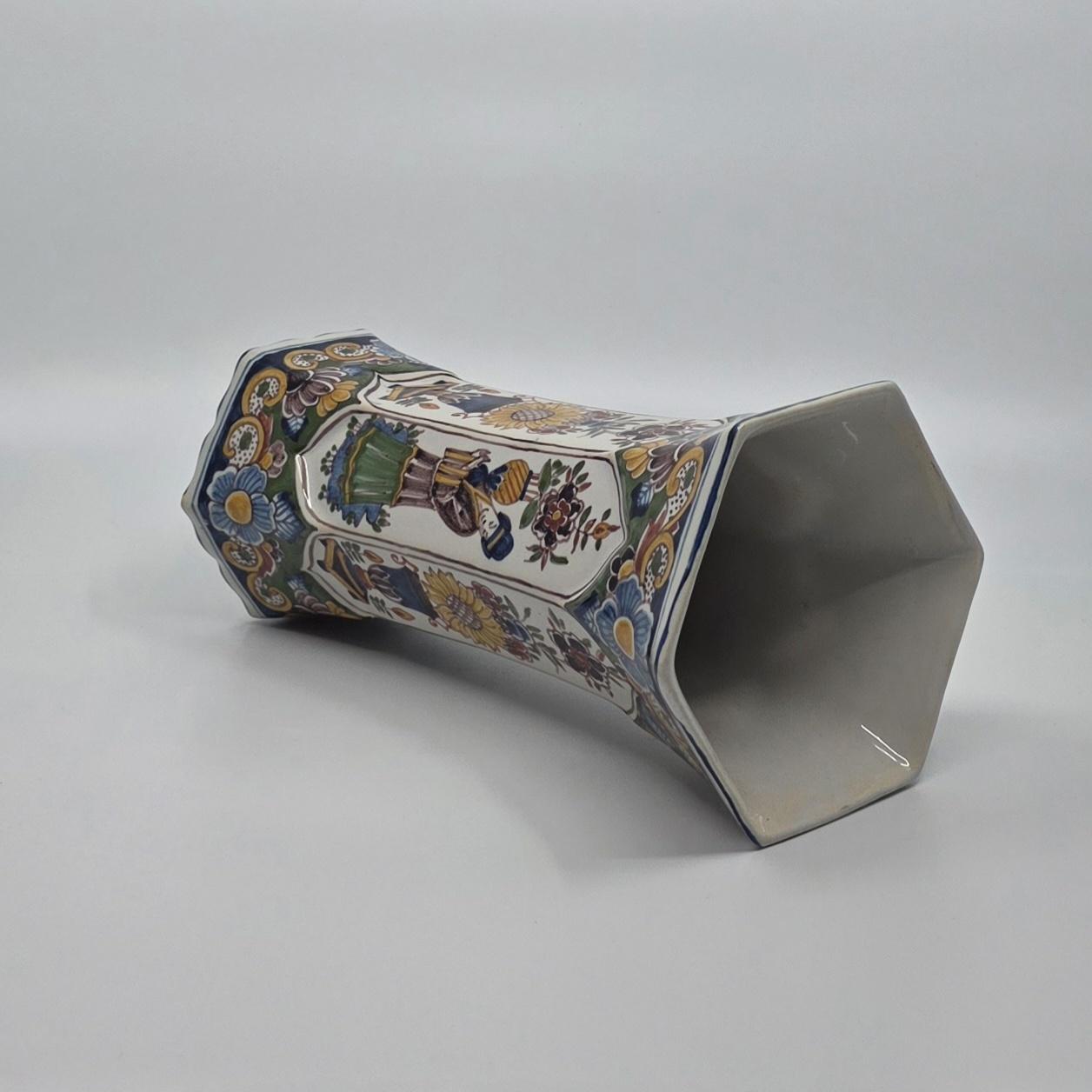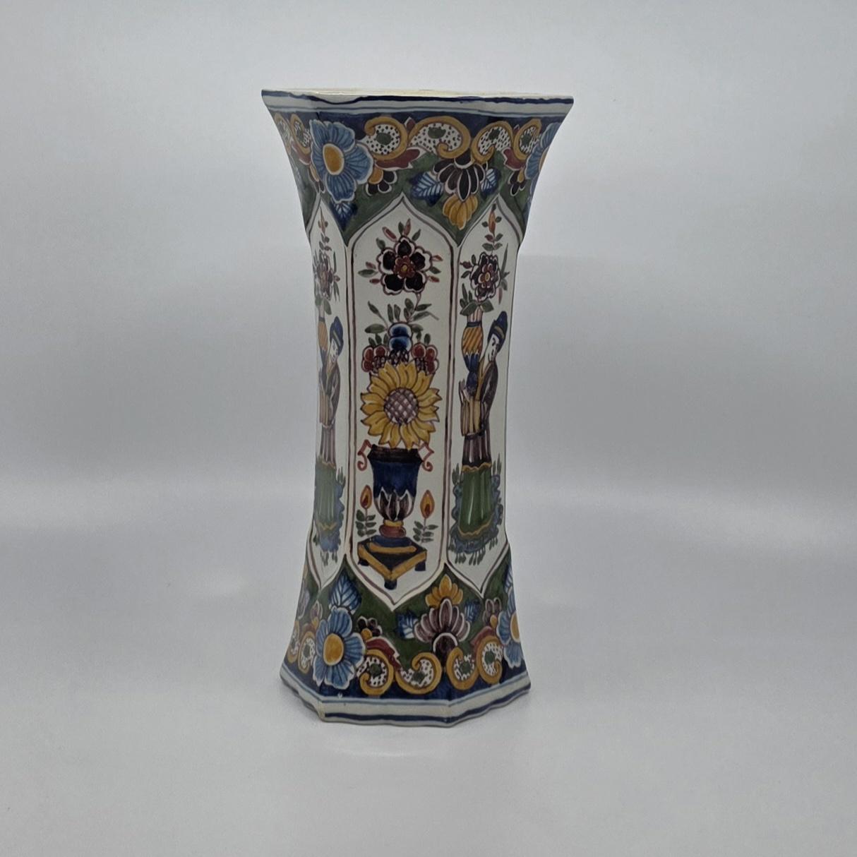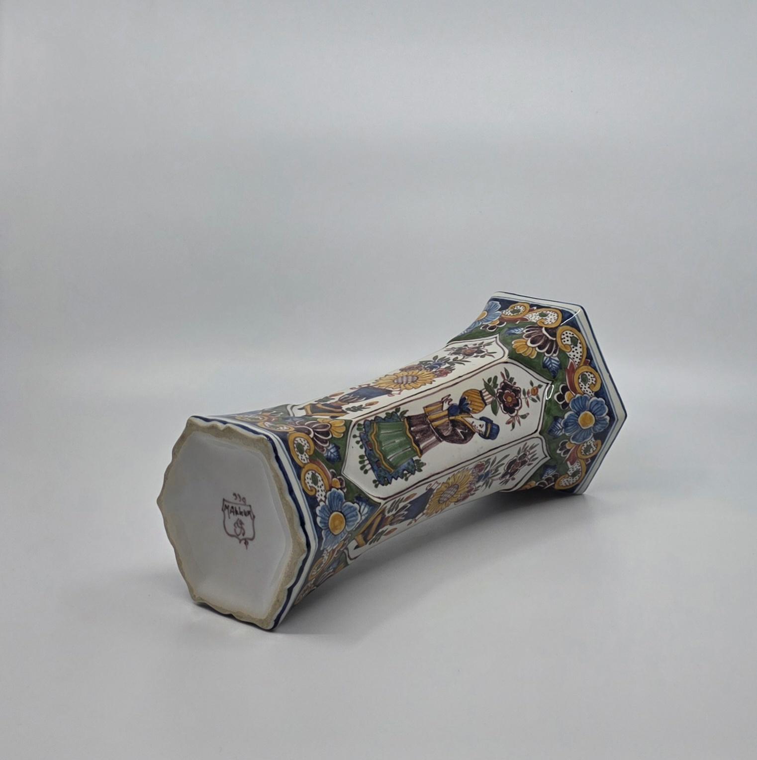 Deze polychrome trompetvaas is met de hand beschilderd omstreeks 1960 bij de Nederlandse aardewerkfabriek Koninklijke Tichelaar Makkum in Friesland. De vaas is versierd met geometrische- en bloemmotieven en er is een Oosters-geklede dame afgebeeld die een bloemenvaas vasthoudt. Aan de onderzijde bevindt er zich het merk van de fabriek Tichelaar, modelnummer en de signatuur van de schilder.