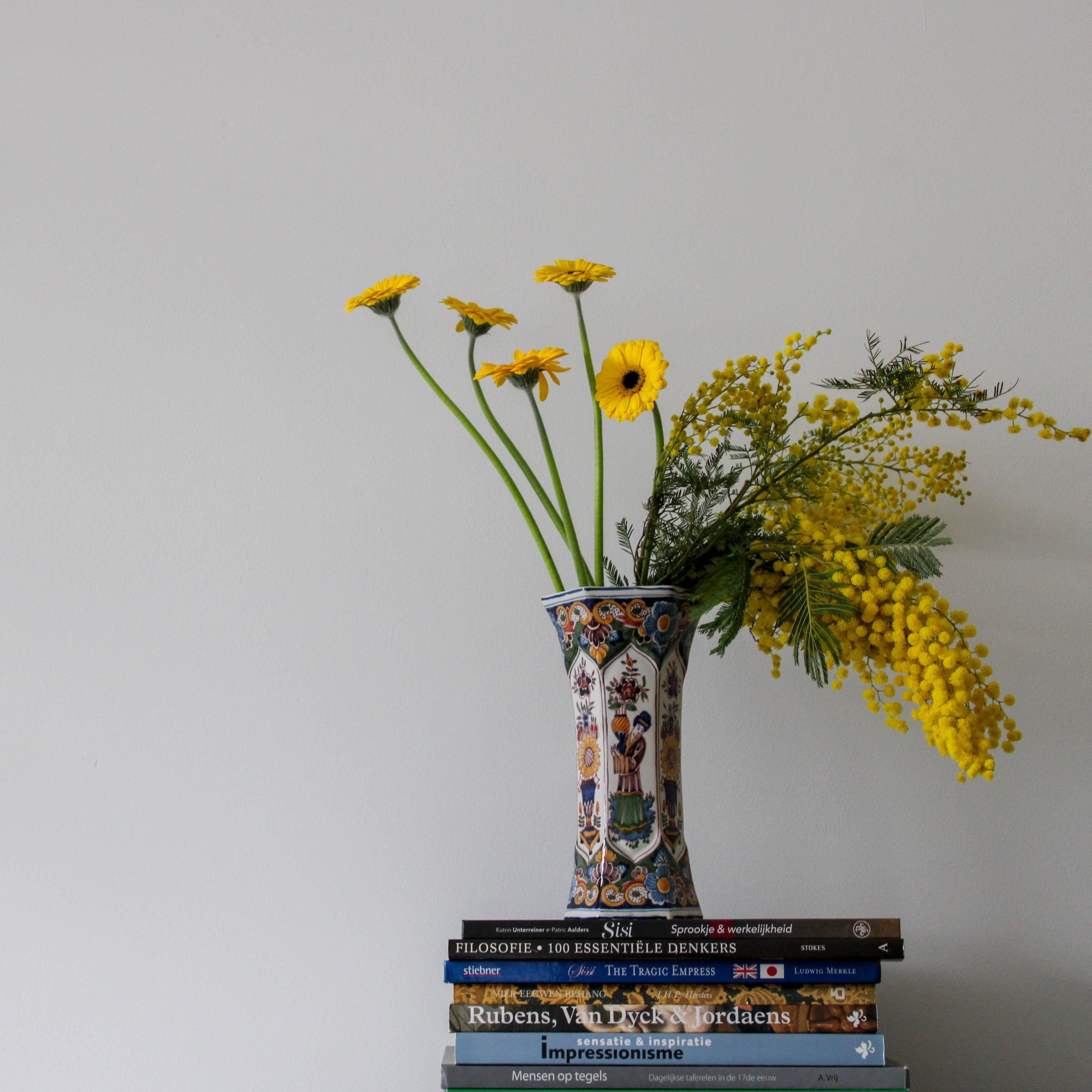 Deze handgeschilderde, kleurrijke trompetvaas is rond 1960 gemaakt bij Koninklijke Tichelaar Makkum (Friesland).