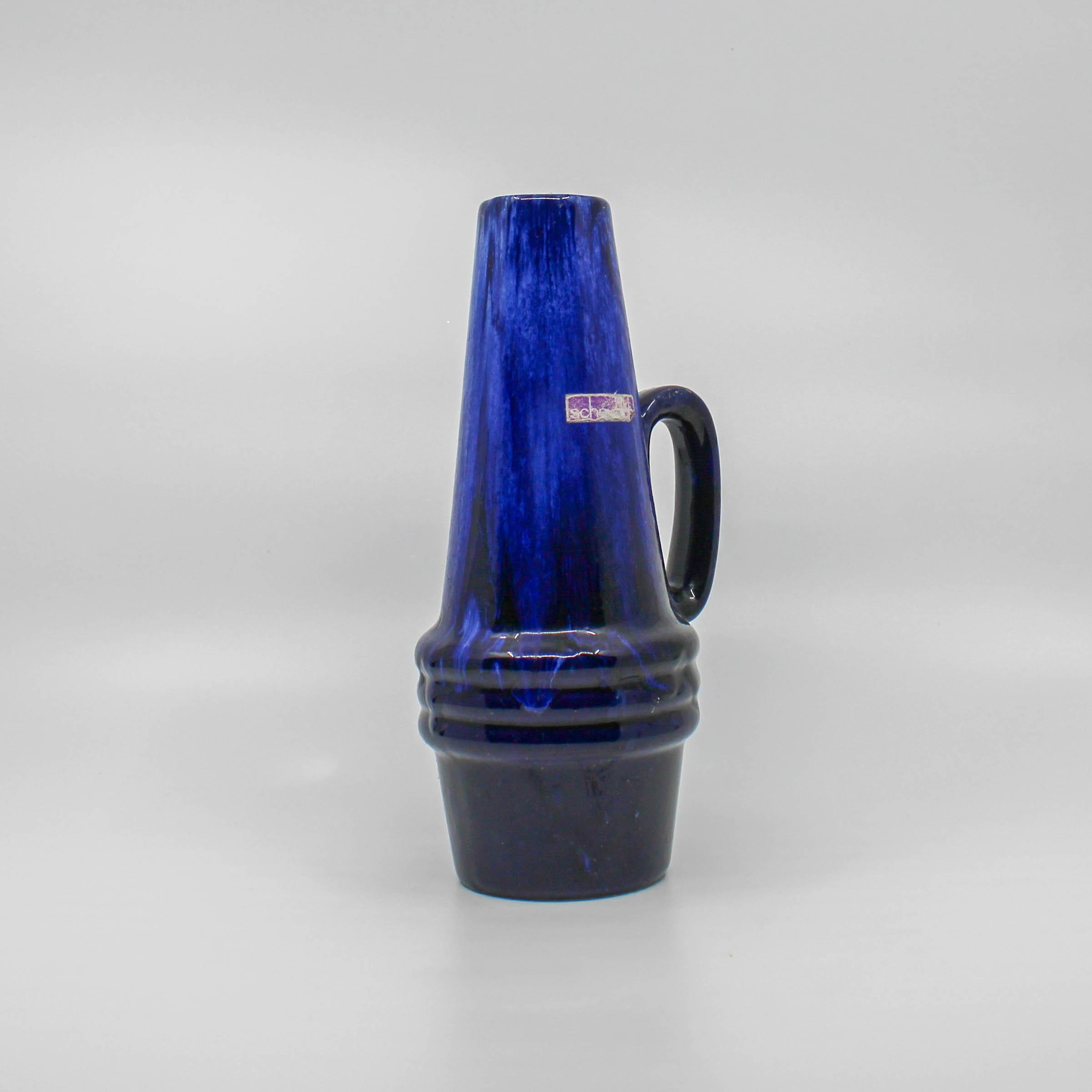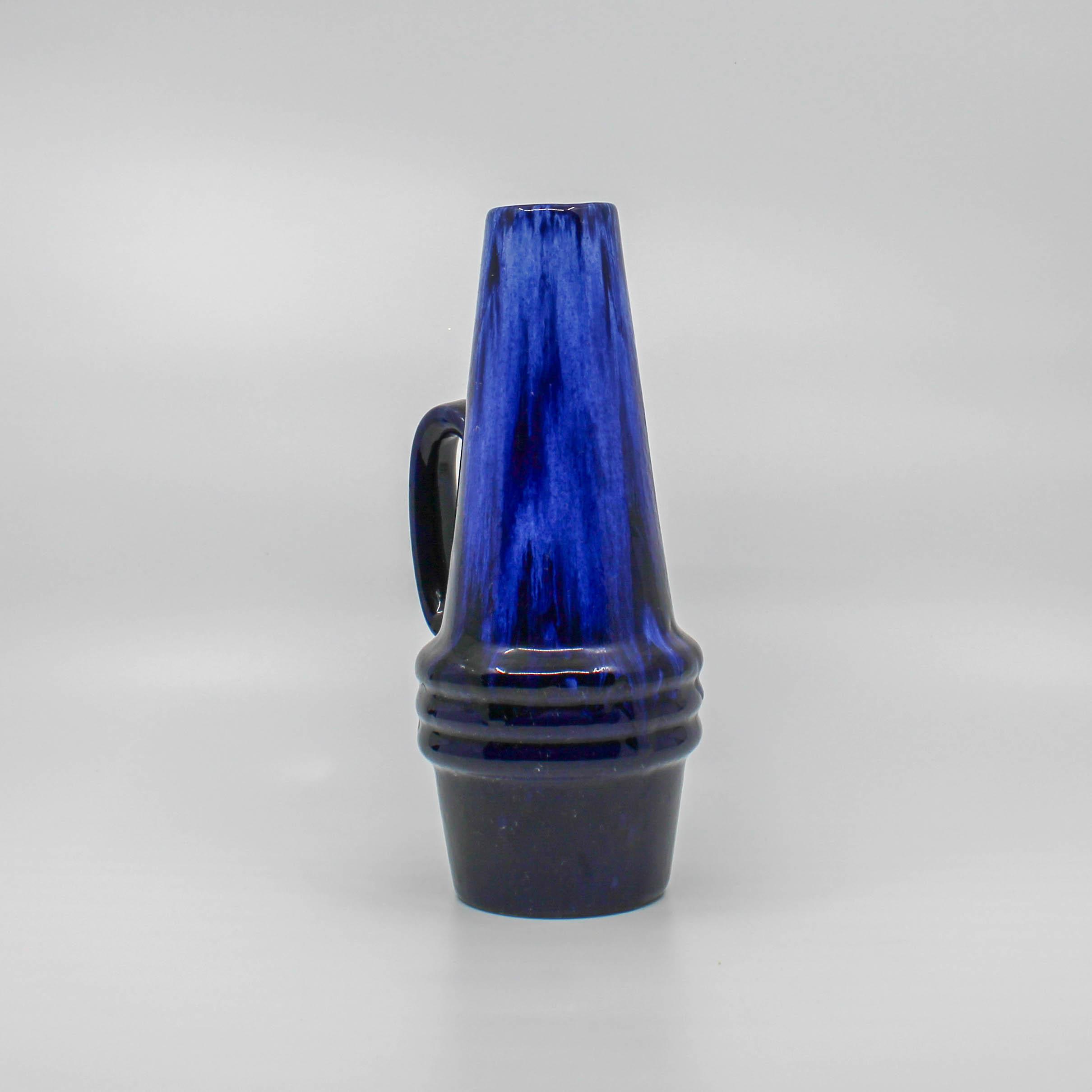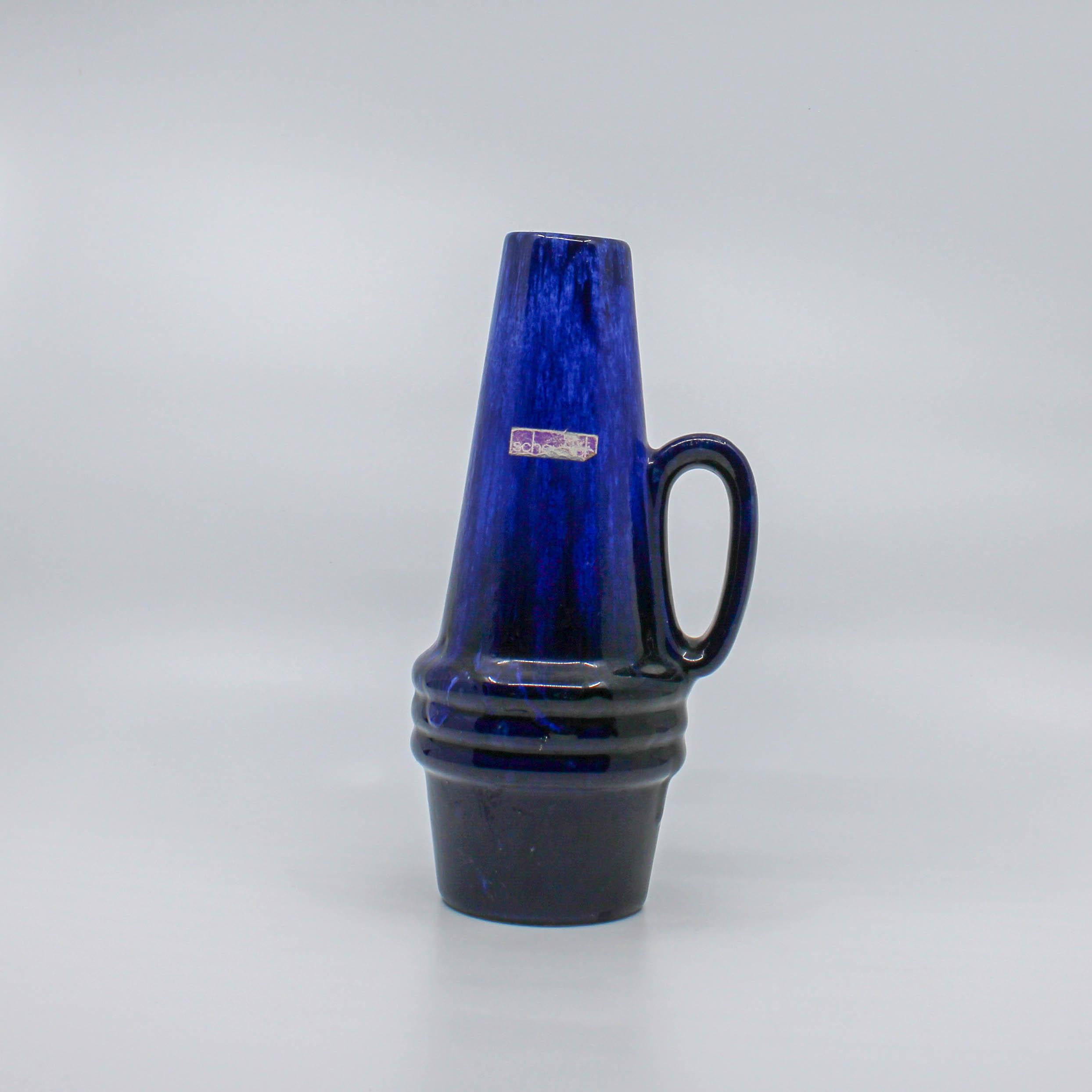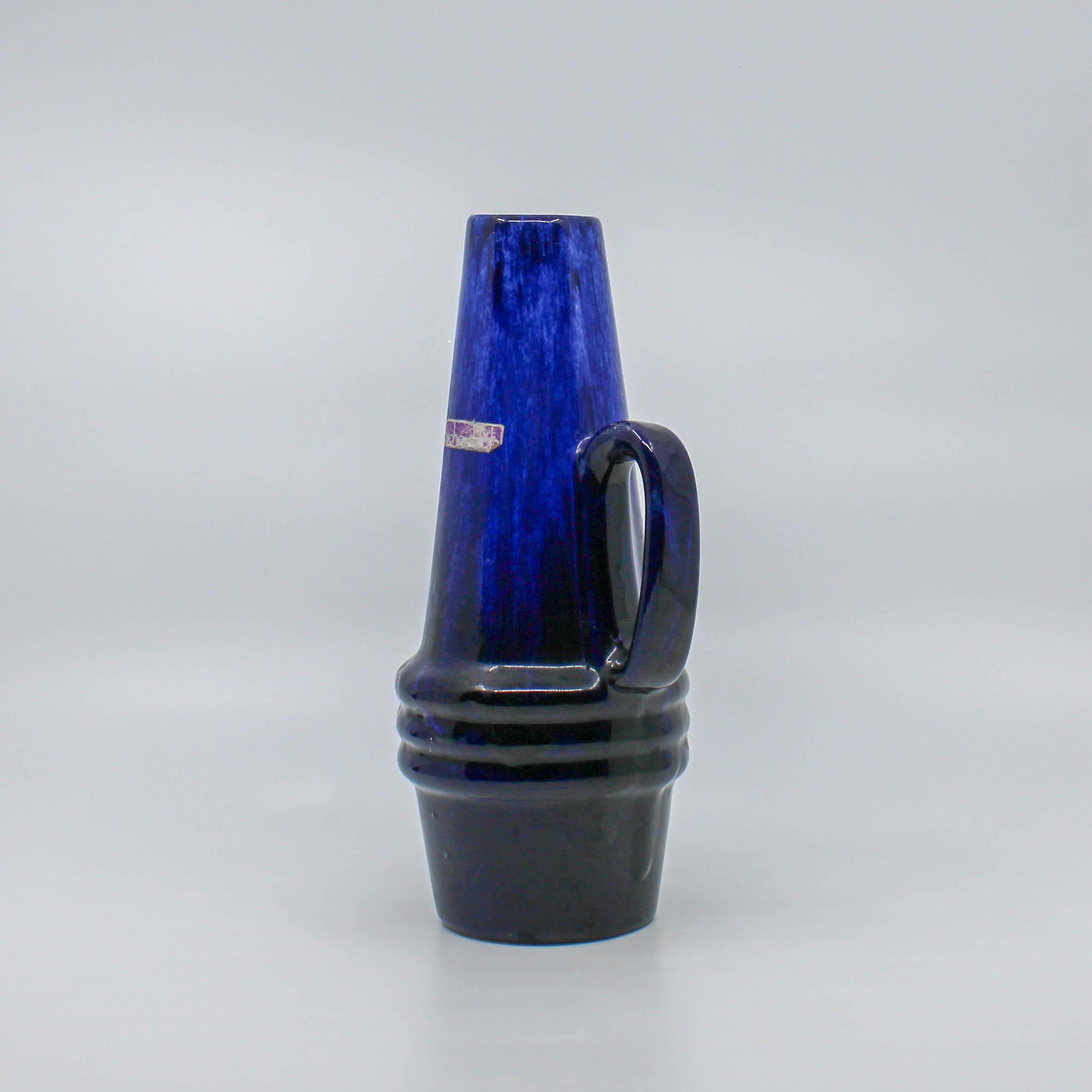Deze West Germany Scheurich kruik is omstreeks 1960 in de fabriek Scheurich in Duitsland vervaardigd. Onderaan de vaas bevindt zich het modelnummer 400 en de hoogte 22 (cm.) De kruik bestaat uit verschillende tinten blauw met zwart.