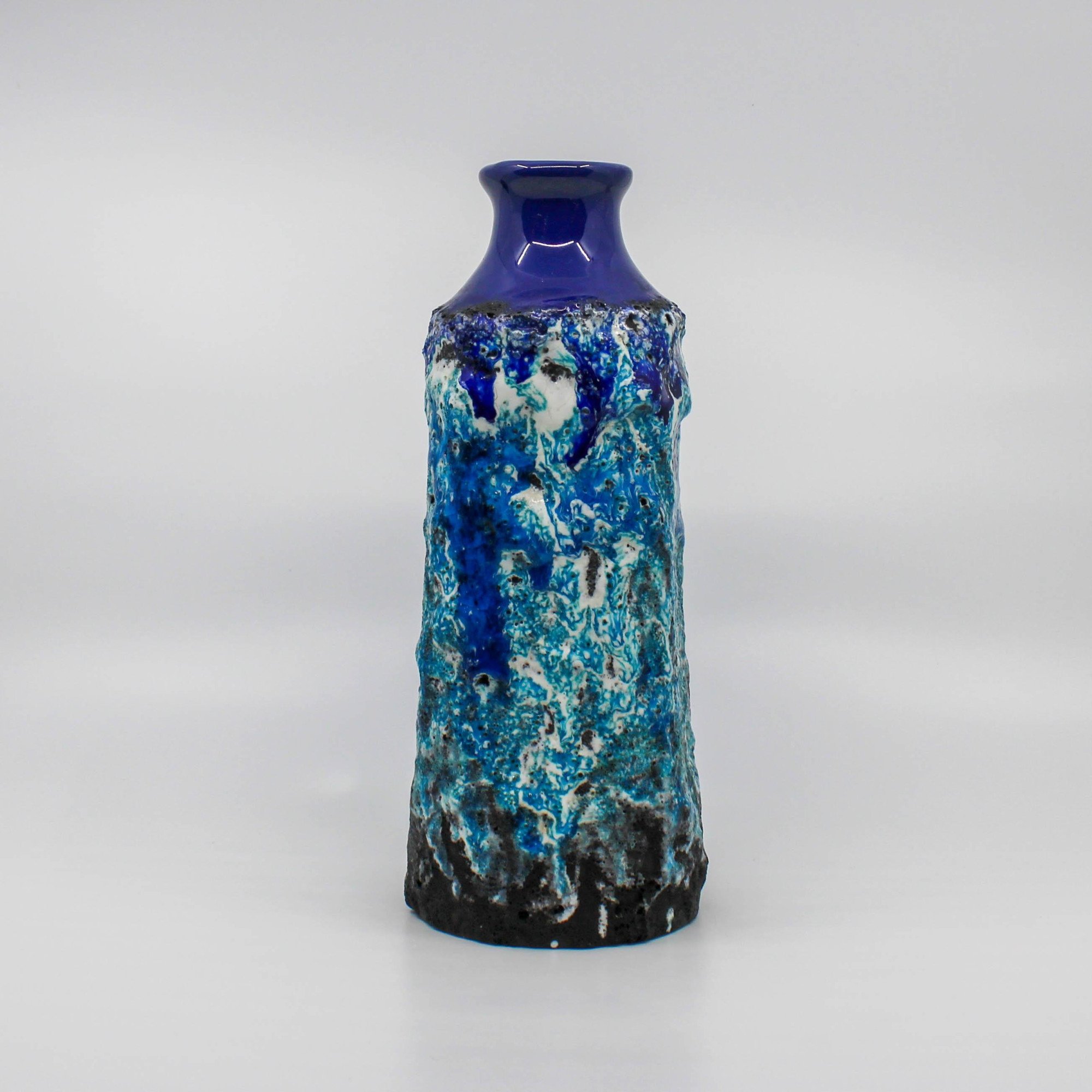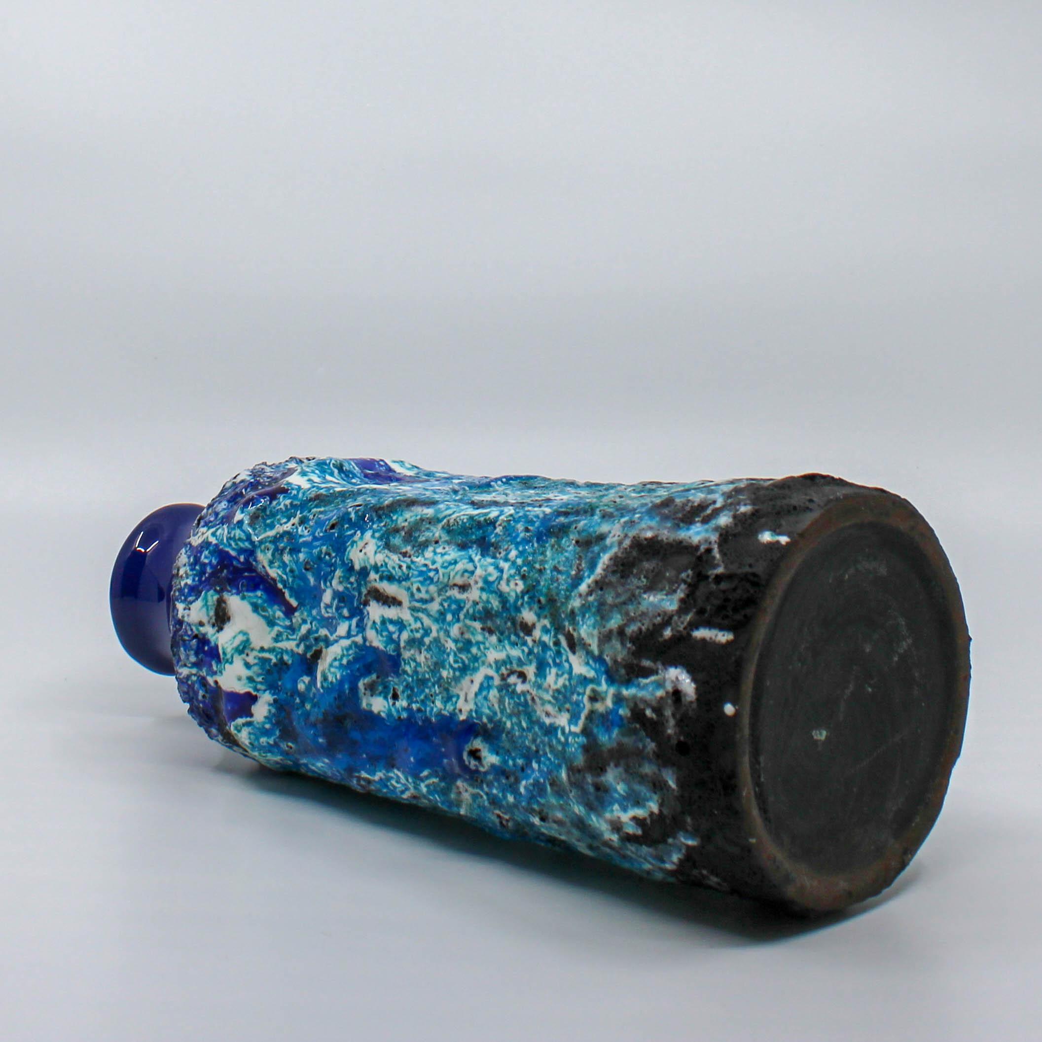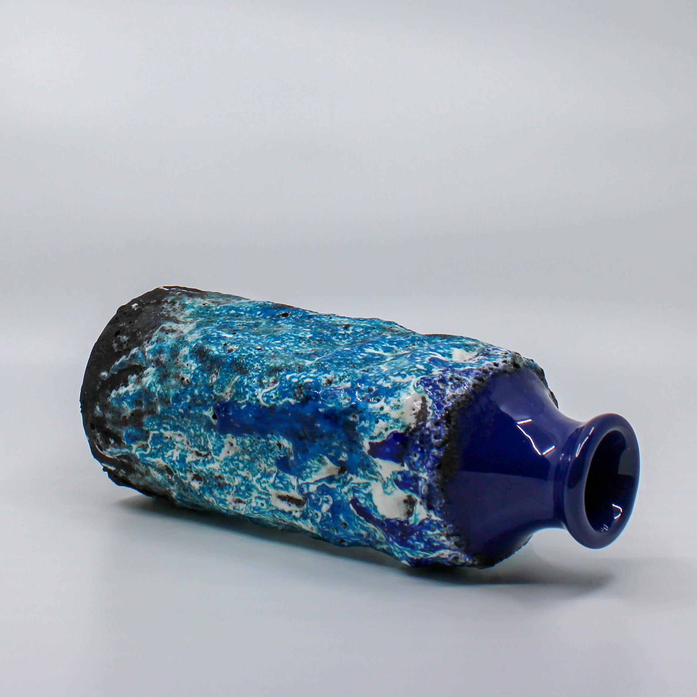 This West Germany vase was manufactured around 1960 at the Marei factory in Germany. This vase has a deep blue glossy glaze on the base and diffrent type of blue colors in reliëf.