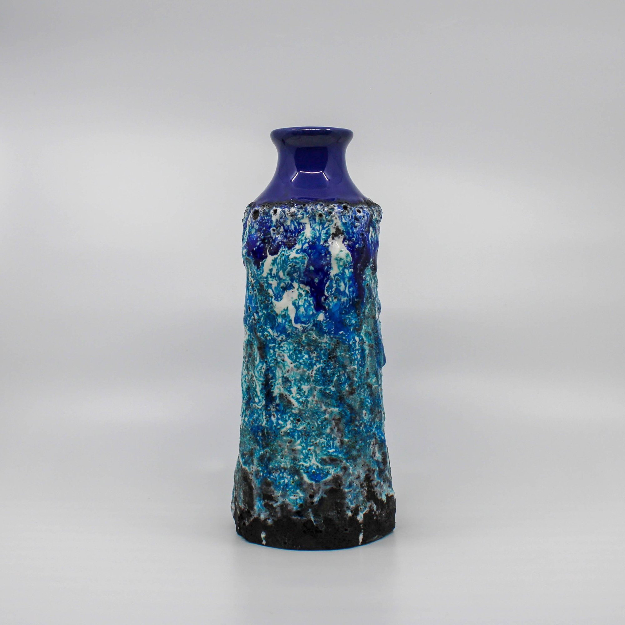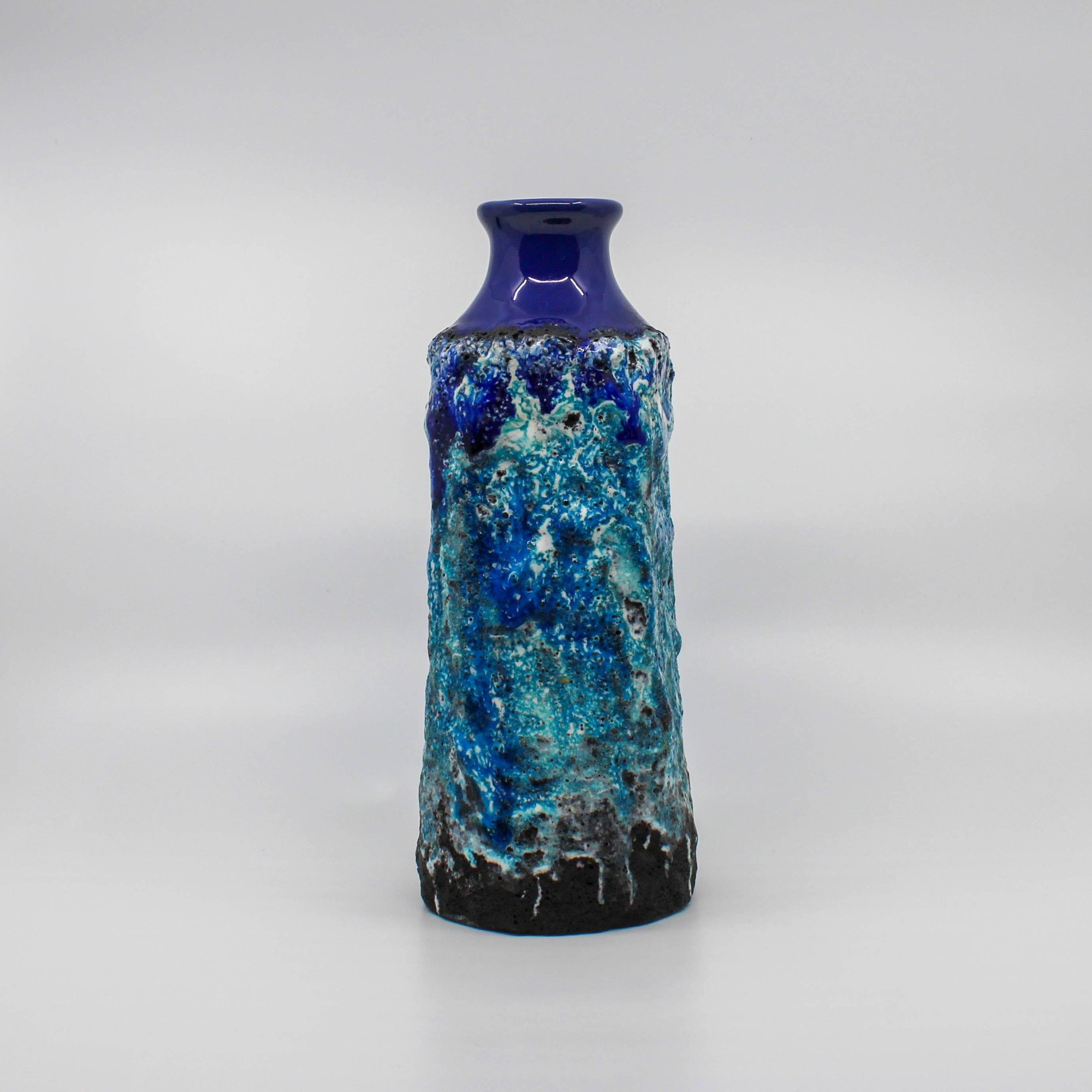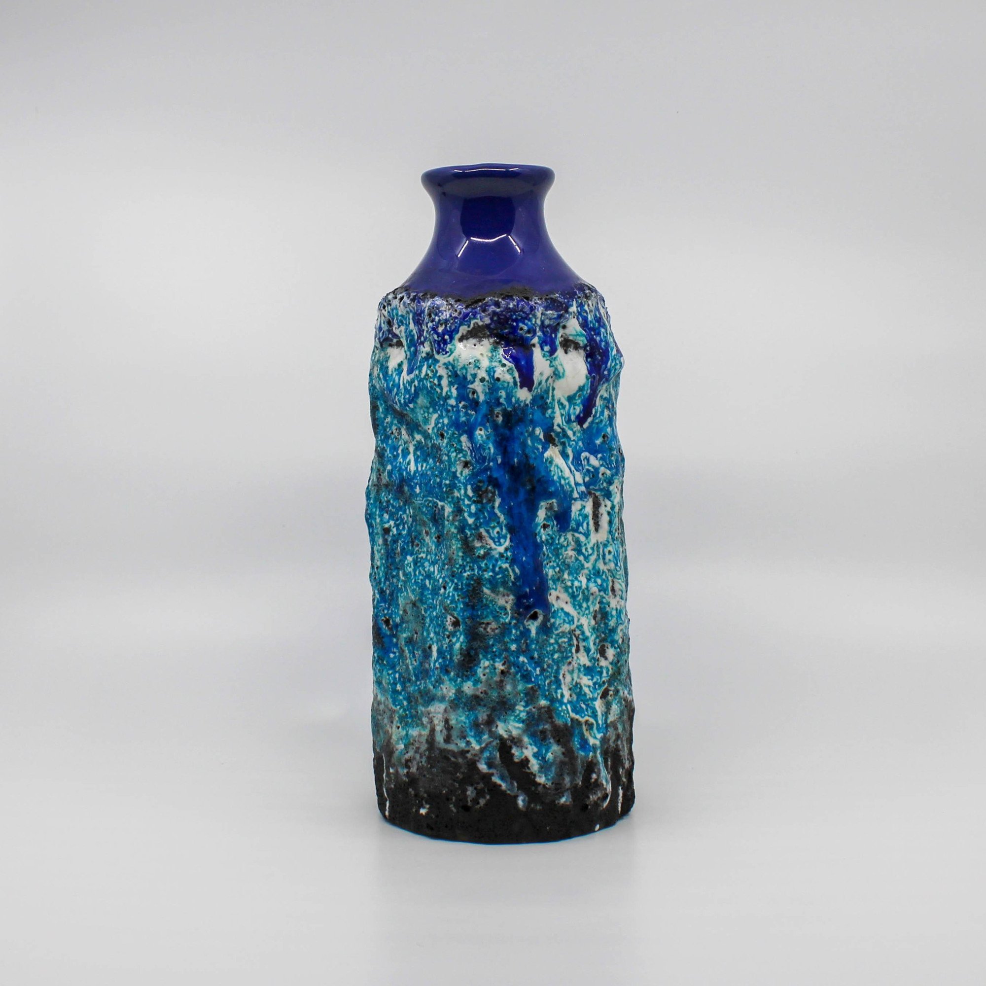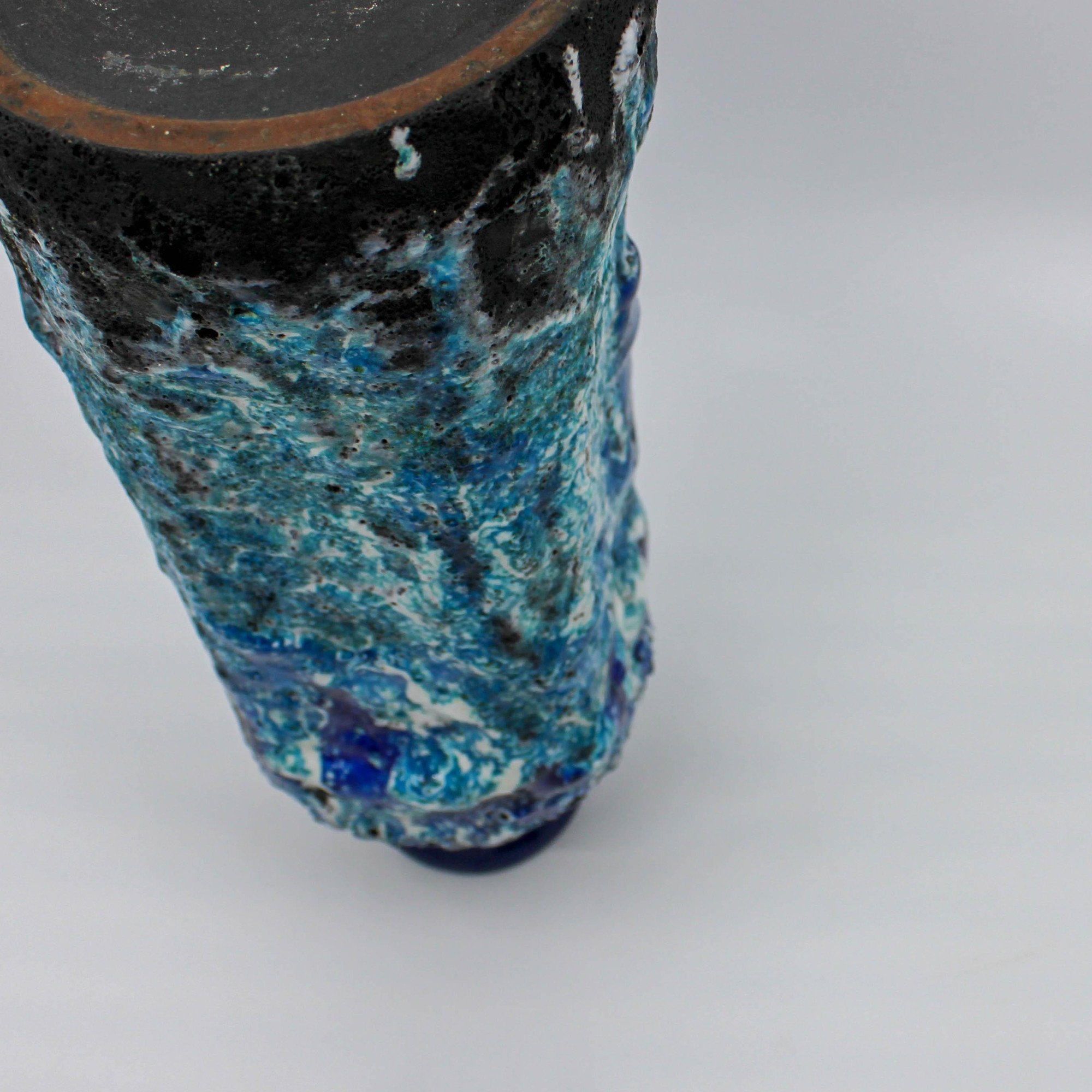 This West Germany vase was manufactured around 1960 at the Marei factory in Germany. This vase has a deep blue glossy glaze on the base and diffrent type of blue colors in reliëf.
