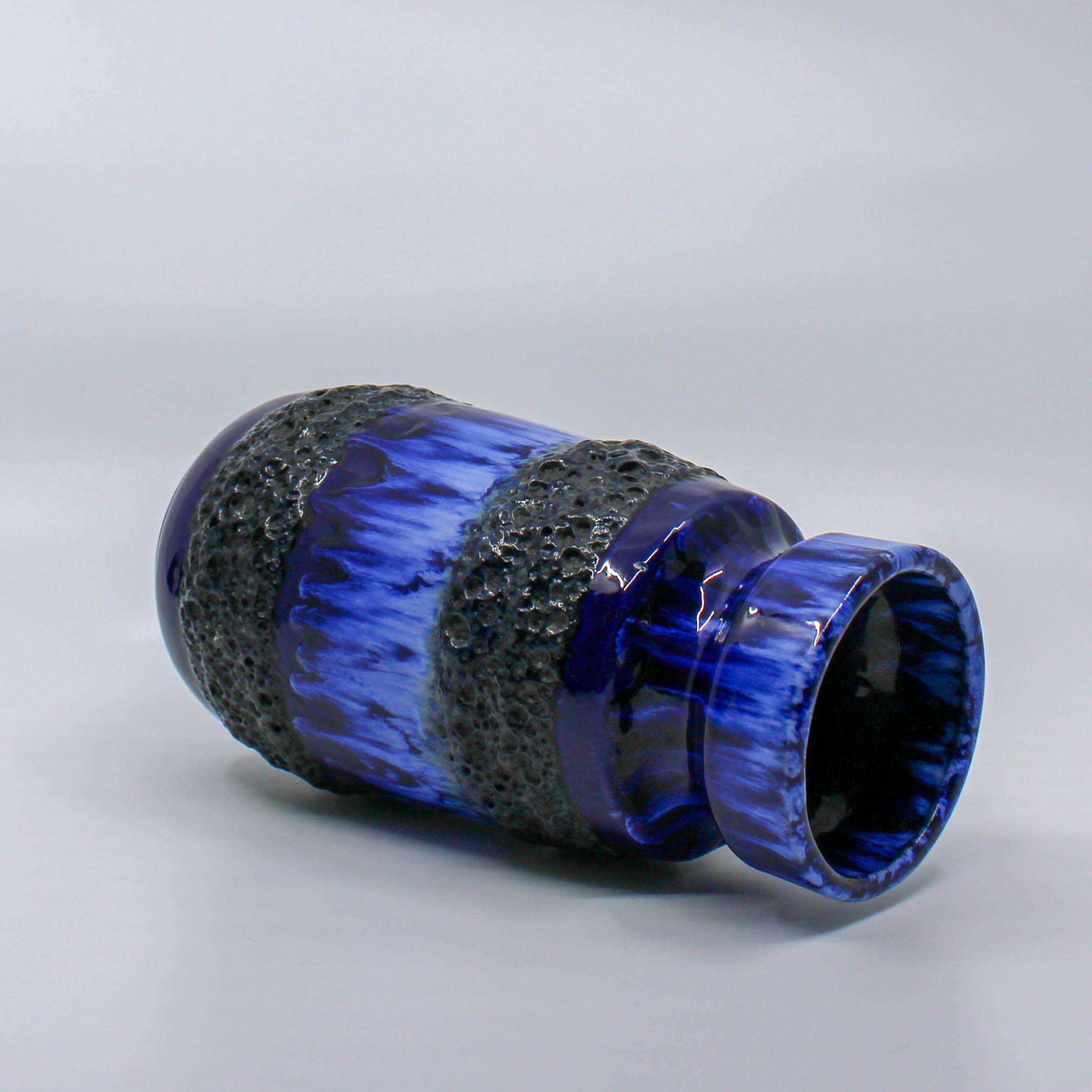 Deze West Germany Scheurich kruik is omstreeks 1960 in de fabriek Scheurich in Duitsland vervaardigd. Onderaan de vaas bevindt zich het modelnummer 424 en de hoogte 22 (cm.) De kruik bestaat uit verschillende tinten blauw en een zwart reliëf.